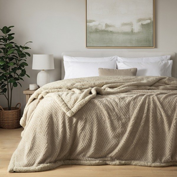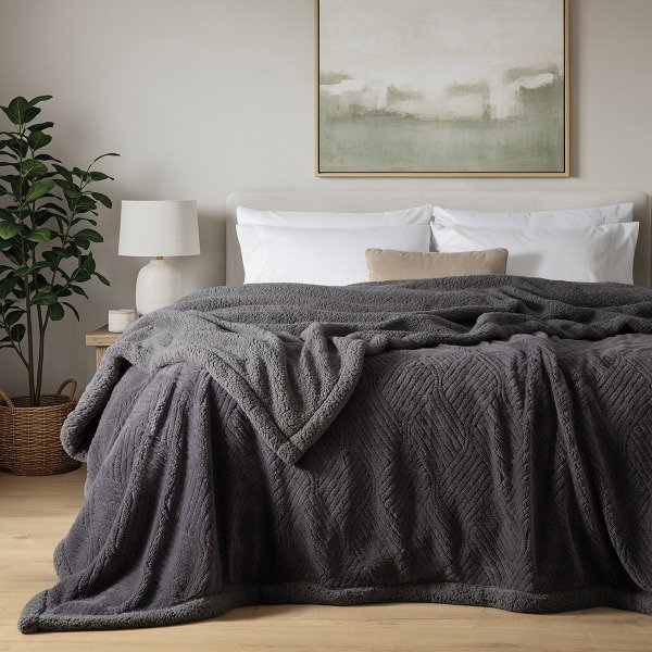 Cubrecama de corderito jacquard con reverso de corderito a tono está diseñada para envolverte en una experiencia de descanso superior, combinando abrigo, suavidad y diseño exclusivo.