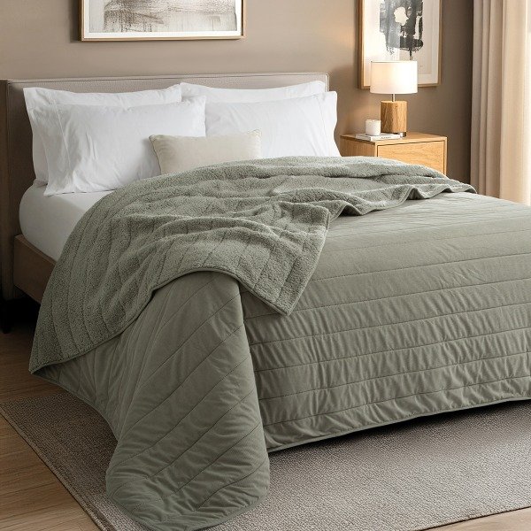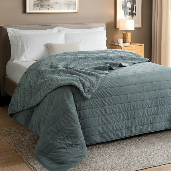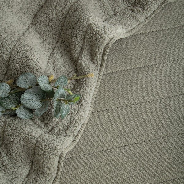 Edredón frente de corderoy combinado con reverso de corderito, on diseño a rayas, crea una sensación cálida y confortable, ideal para disfrutar noches mucho más acogedoras.