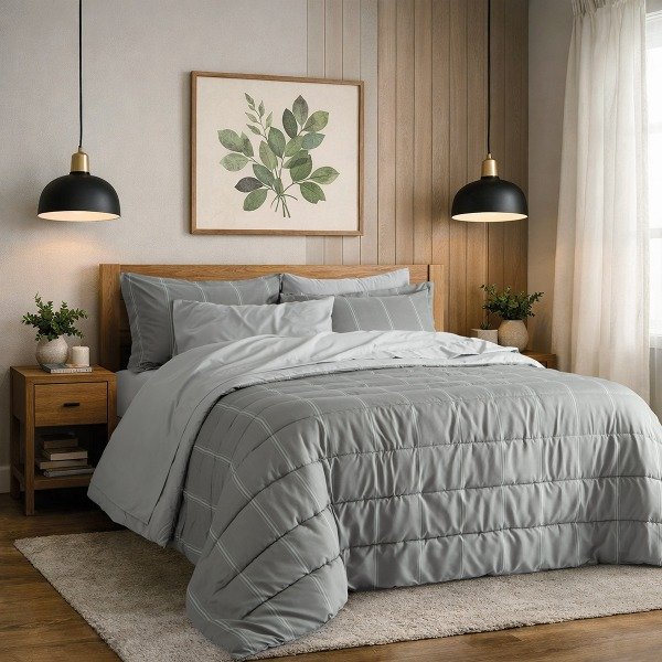 Kit de 5 y 7 piezas de microfibra estampada brushed compuesto por alcolchado mateleasado + 2 fundas de almohadón + juego de sábanas lisas en composé