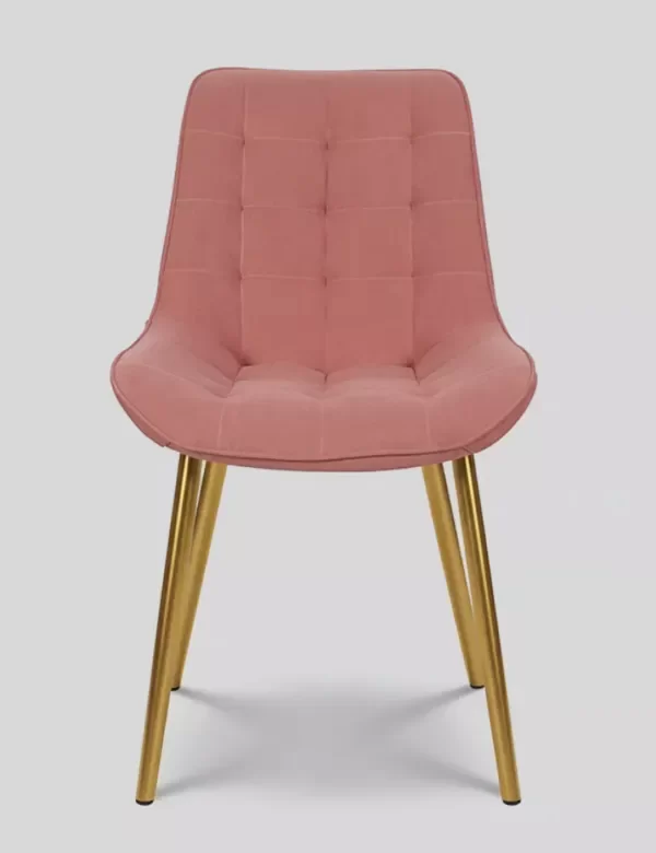 Asiento acolchado Tapizada en Velvet aterciopelado color Rosa. Patas metálicas CROMADAS DORADAS, . Medidas totales: 47 cm de ancho x 44 cm de profundidad x 87 cm de alto. Medidas del asiento: 50 cm de ancho x 42 cm de profundidad x 48 cm de altura del piso al asiento.